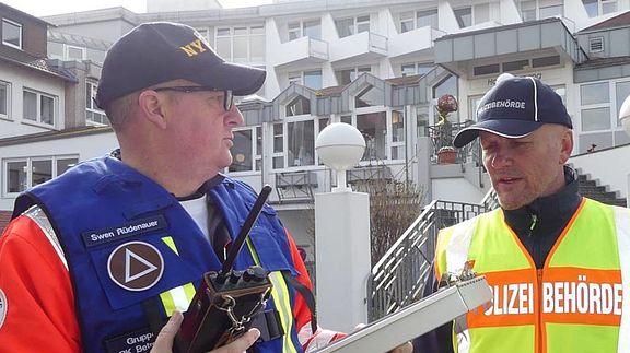 Einsatzleiter Swen Rüdenauer (links) erläuterte Christian Völker, der in seiner Eigenschaft als Fachbereichsleiter für Ordnung und Soziales der Stadt Bad Mergentheim anwesend war, das Ziel der Groß- Übung. © BERND HELLSTERN