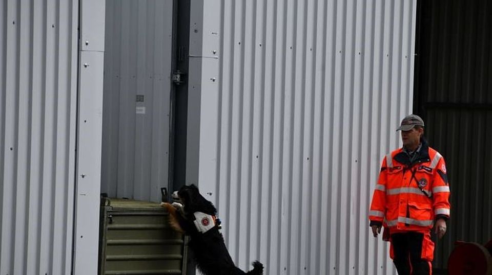 Eine nicht ganz einfache Station befindet sich am Bauhof des Truppenübungsplatzes. Die Hunde haben bei der freien Suche ohne Leine gleich zwei Aufträge zu erledigen. Neben einer Person, die in der Hecke sitzt, muss auch ein Vermisster zwischen zwei Hallen gefunden werden. Die Krux: Der „Zugang“ ist versperrt. „Um diese Suche erfolgreich abzuschließen, braucht ein Hund ein räumliches Vorstellungsvermögen“, macht Frieder Schaefer vom Kreisverband Reutlingen deutlich. Denn der Hund hat zwar den Geruch von vorne, der unter der Metallwand durchkommt, erreicht den Vermissten aber nicht auf direktem Weg. Entweder überwindet er das Hindernis mit einem beherzten Sprung oder sucht sich seinen – viel weiteren – Weg um das Gebäude herum. Lang braucht der Flächensuchhund nicht, bevor er sich sicher ist und die vermisste Person anzeigt. Lautstark bellt der Vierbeiner und macht deutlich, dass er erfolgreich war. Mit einem schnellen Sprung über den Container ist auch der letzte Zweifel einer geglückten Suchaktion zerstreut.
